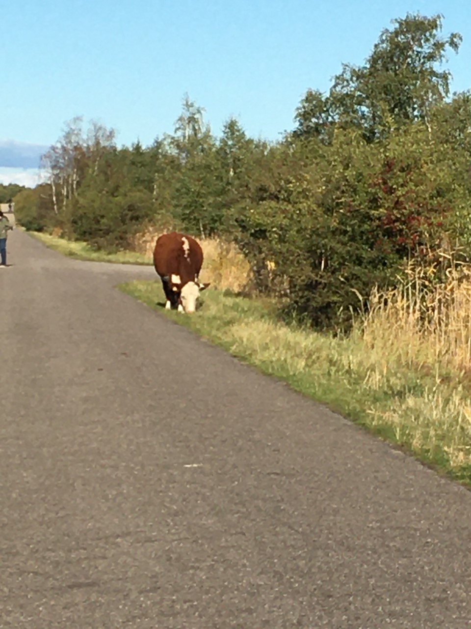 Der var en hel del mennesker derude. Og køer. Altså - de fleste køer stod pænt på deres mark bag hegnet, men denne her gik rundt ved vejen og spiste det (åbenbart) meget grønnere græs.